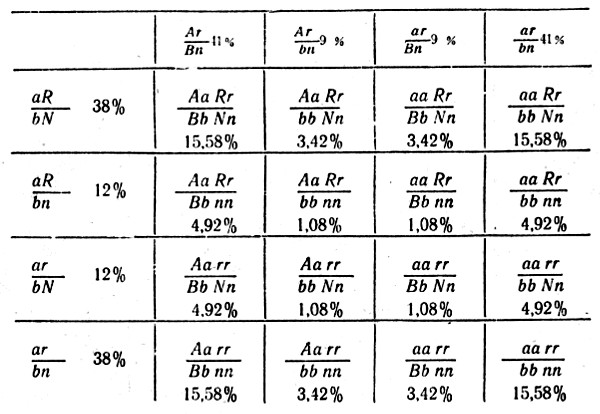 морганидам. Это означает, что кроме нормальных гамет без обмена генами образуется 20% гамет с обменявшимися участками хромосом: 10% A/b и 10% a/B.