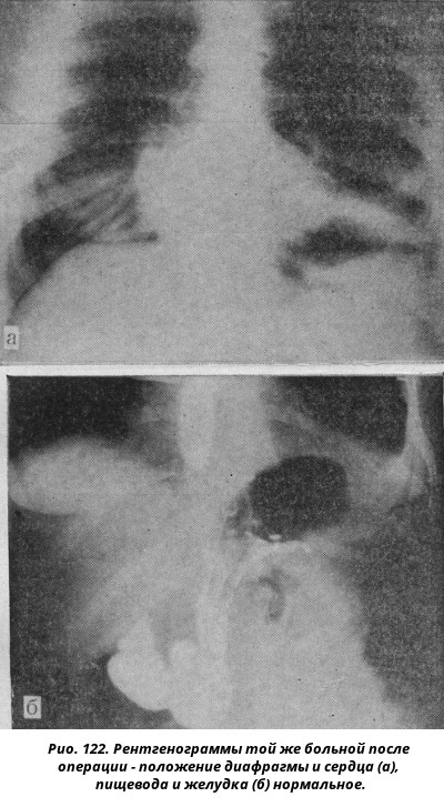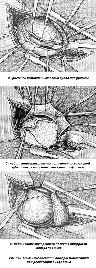 Лечение. Вопрос о лечении различных поражений диафрагмы решается неодинаково. У больных с грыжей диафрагмы возможность ущемления является прямым показанием к операции. При релаксации диафрагмы операция показана лишь в случае выраженных нарушений здоровья, если симптомы заболевания выражены слабо, целесообразно проводить консервативное лечение. Предоперационная подготовка при грыжах и релаксации диафрагмы состоит в назначении за 2-3 дня до операции диеты, дающей мало шлаков, приема слабительных и назначения накануне операции и рано утром в день вмешательства очистительных клизм (до чистой воды). Для операций при грыжах и релаксации диафрагмы методом выбора обезболивания является современный эндотрахеальный наркоз с применением миорелаксантов и управляемого дыхания, которое может осуществляться как вручную, так и с помощью респираторов типа "Энгстрем" или ЭРО - 62. Такое обезболивание дает возможность выполнять все манипуляции на расслабленной диафрагме, что облегчает ушивание дефектов и позволяет избежать пересечения диафрагмального нерва. Выбор доступа зависит от локализации и размеров дeфекта, возраста и состояния больного и предполагаемого характера оперативного вмешательства. Так, при парастернальных грыжах более удобен трансабдоминальный доступ, в частности верхняя срединная лапаротомия. При операциях на всех остальных отделах правого купола диафрагмы применяется трансторакальный доступ в седьмом или восьмом межреберье, который также наиболее предпочтителен и при манипуляциях на всех отделах левого купола у взрослых больных. У детей при врожденных ложных грыжах, когда обычно отсутствуют сращения выпавших органов с грудной стенкой, а также при паллиативных внутрибрюшных операциях по поводу релаксации применяют трансабдоминальные разрезы. Остановимся на некоторых особенностях операции при диафрагмальной грыже, целью которой является низведение перемещенных органов и ушивание дефекта в диафрагме. Нередко, особенно при травматических диафрагмальных грыжах, приходится разделять многочисленные сращения и спайки между выпавшими органами и грудной стенкой, а также грыжевыми воротами. Эту манипуляцию следует производить очень осторожно, поскольку повреждение, например, выпавшей селезенки, заставляет удалять ее во избежание послеоперационного кровотечения. После низведения выпавших органов в брюшную полость необходимо ушить дефект диафрагмы. Обычно края дефекта сшивают отдельными узловыми толстыми шелковыми швами, стараясь при возможности создать дупликатуру, если ткань диафрагмы недостаточно прочна. При очень больших размерах дефекта края его стянуть не удается и приходится прибегать к различным пластическим методам. Из различных вариантов органопластики в настоящее время некоторое значение сохраняет лишь гепатопексия: использование других органов оставлено в связи с опасностями создания фиксированной диафрагмальной грыжи. Также весьма травматично использование различных аутопластических методов с выкраиванием мышечных, мышечно-плевральных и мышечно-надкостничных лоскутов. Нежелательны и различные варианты торакопластики, направленные на приближение грудной стенки к краям дефекта, в связи с наступающей при этом выраженной деформацией последней. Большее распространение пол