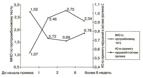 По данным обширных рандомизированных, многоцентровых и ретроспективных исследований, обобщенных в материалах VI АССР Американского консенсуса по антитромботической терапии (2000) и в Chest (2001), при правильно налаженном лабораторном контроле частота минимальной и малой кровоточивости при терапевтическом применении варфарина в прошлом составляла около 4%, а в наши дни в связи со снижением применяемых доз препарата и улучшением контроля — до 1-2%, а больших геморрагии - лишь 0,1%. С осторожностью и в меньших дозах препарат должен применяться у стариков старше 70-75 лет. Лабораторный контроль за действием препарата у лиц преклонного возраста должен производиться чаще, чем при аналогичных ситуациях у более молодых людей. Убедительных данных о том, что в старческом возрасте частота геморрагических осложнений при приеме варфарина выше, чем у людей среднего возраста, в литературе нет, но следует учитывать, что элиминация кумаринов из крови у стариков замедлена, поэтому у них МНО следует поддерживать на уровне 1,4-1,7. Из других осложнений, изредка возникающих под влиянием кумаринов, заслуживают упоминания кожные некрозы, развитие которых наблюдается обычно между третьим и восьмым днями приема препарата. Это осложнение связано с избыточной депрессией протеина С в первые дни приема варфарина, вследствие чего тромбируются микрососуды в коже. Такое осложнение обычно возникает у людей с нераспознанным наследственным дефицитом этого антикоагулянта. Оно требует прекращения приема варфарина и трансфузий cвежезамороженной плазмы либо внутривенных введений концентрата протеина С. Подбор доз варфарина и необходимая периодичность контроля за показаниями ПТ Анализ ряда больших многоцентровых исследований, проведенных в последние годы, показал, что противотромботическая эффективность кумаринов примерно одинакова при поддержании МНО (INR) в пределах 2,0-3,0 и при повышении этого индекса до 3,5-4,5, но при последних цифрах существенно возрастает число и тяжесть геморрагических осложнений (J.Ansell et al., 2001; J.Hirsh et al., 2001 и др.). Более того, у онкологических больных и в старческом возрасте эффект варфарина бывает достаточным даже при поддержании МНО на уровне 1,4-1,7. Все это привело к пересмотру прежних рекомендаций проводить более интенсивную антикоагулянтную терапию, главным недостатком которой является риск развития геморрагии и то, что большие дозы кумаринов на начальном этапе их применения вызывают выраженное снижение уровня в крови важнейшего физиологического антикоагулянта — протеина С. Аналогичные данные получены и при назначении разных начальных доз кумаринов. Оказалось, что начальные дозы 5 мг/сутки и 10 мг/сутки в одинаковой степени эффективны, но вторая доза чаще провоцирует геморрагические осложнения (Harrison et al., 1997; J.Hirsh et al., 2001). Все это привело к тому, что начальное применение варфарина в случаях, где к нему нет противопоказаний, проводится назначением больным этого препарата в дозе 5 мг/сутки. Дальнейшая корректировка дозы проводится по учету динамики МНО, которое в подавляющем большинстве клинических ситуаций должно поддерживаться в интервале 2,0-3,0, а в ряде случаев - на уровне 1,4-2,0. Менее одинаково отвечают разные исследователи на вопрос, какова должна быть частота исследований ПТ у больных, принимающих варфарин. На раннем этапе приема этих 